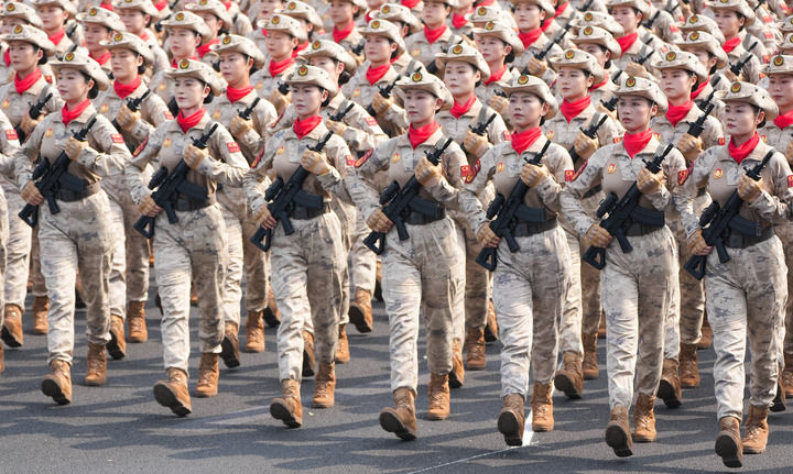 9月3日,天安门广场。身着蛙式作训服、手握钢枪的女民兵,身姿挺拔、英姿飒爽。她们来自当年的主要抗日根据地。这是民兵首次亮相以纪念抗战为主题的阅兵活动。
